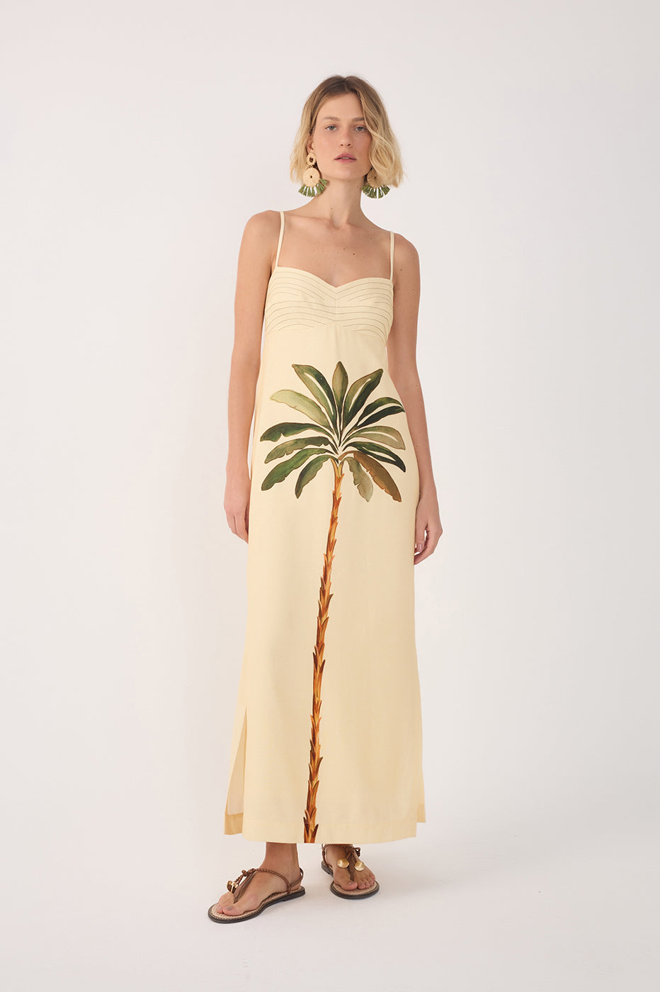 Cream colored maxi dress with green stitched bust and palm graphic