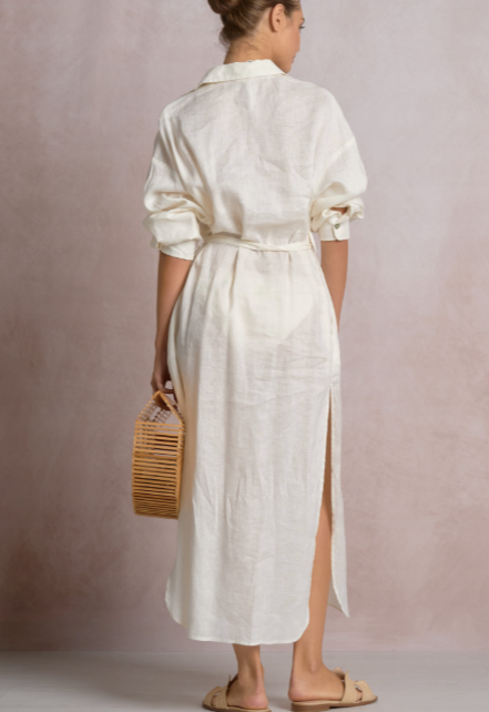 100% cream linen dress. Details include high slits, pockets, buttons down the front and a beaded belt.
