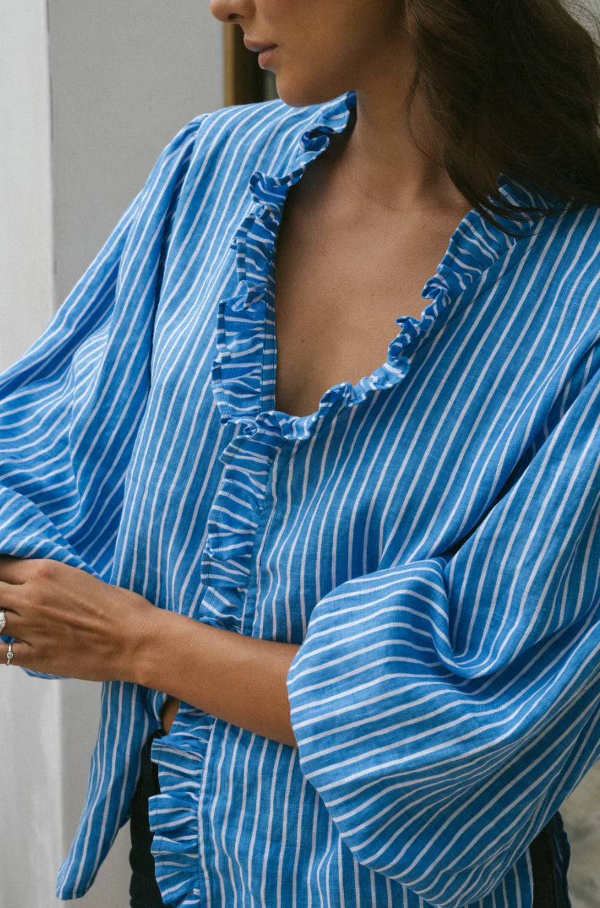 The ruffle Olive shirt available in our stunning ocean blue stripe features a full buttoned down front and balloon sleeves for that statement wardrobe piece.