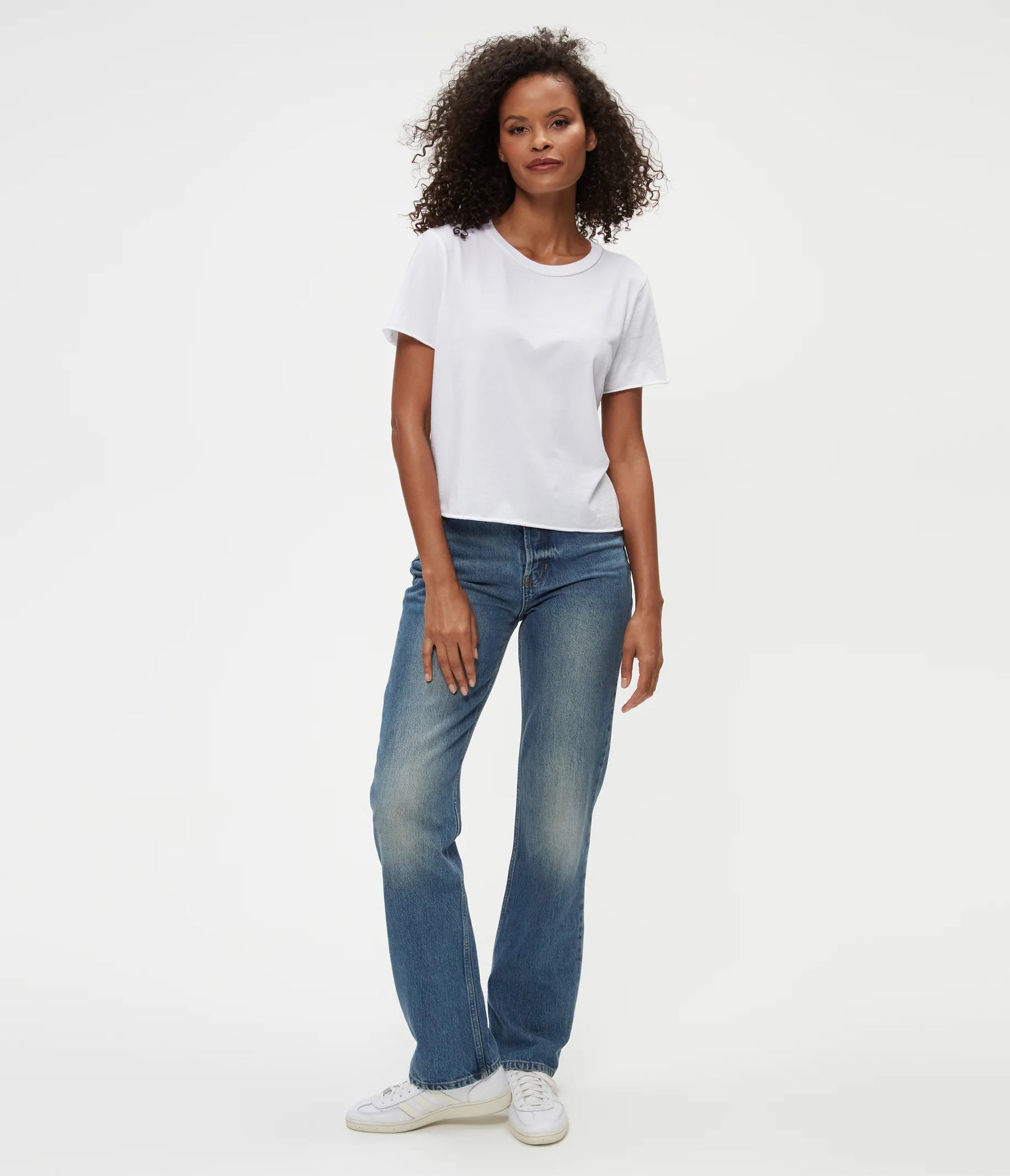 The cropped version of the Becca Tee, Jackie is a short sleeved, easy fitting crewneck with rolled hems at the sleeves and bottom hem. A tee that’s made in LA and made to last.