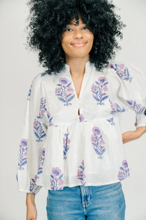 This blouse features long sleeves, v-neckline, and a flowy silhouette creating a relaxed fit.