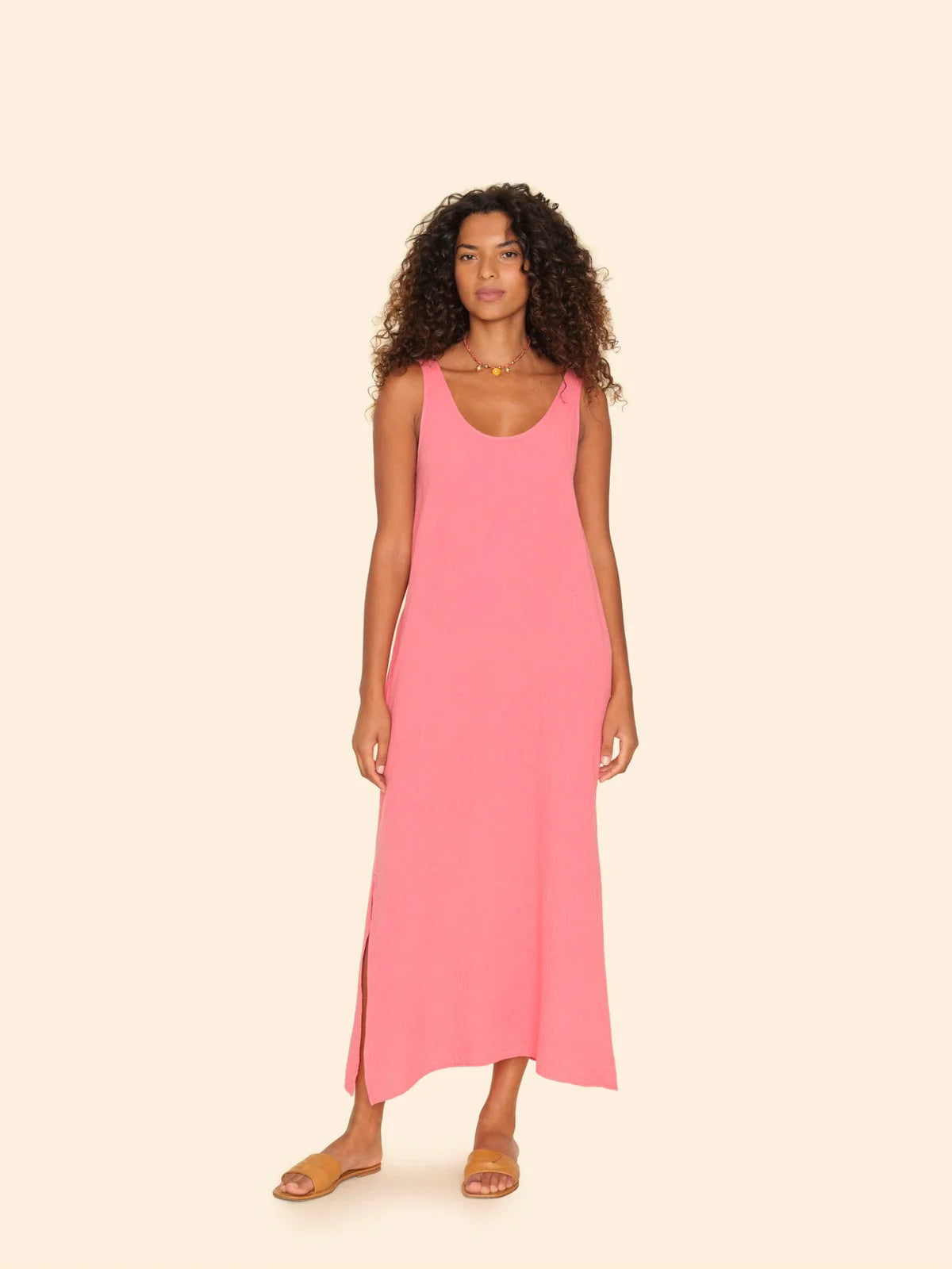 Easy Breezy. Amelin is new this season in our washed double faced cotton gauze for a soft, gently crinkled feel. Amelin is a flowy tank midi dress with a scoop neck, side seam pockets, and hem side slits.