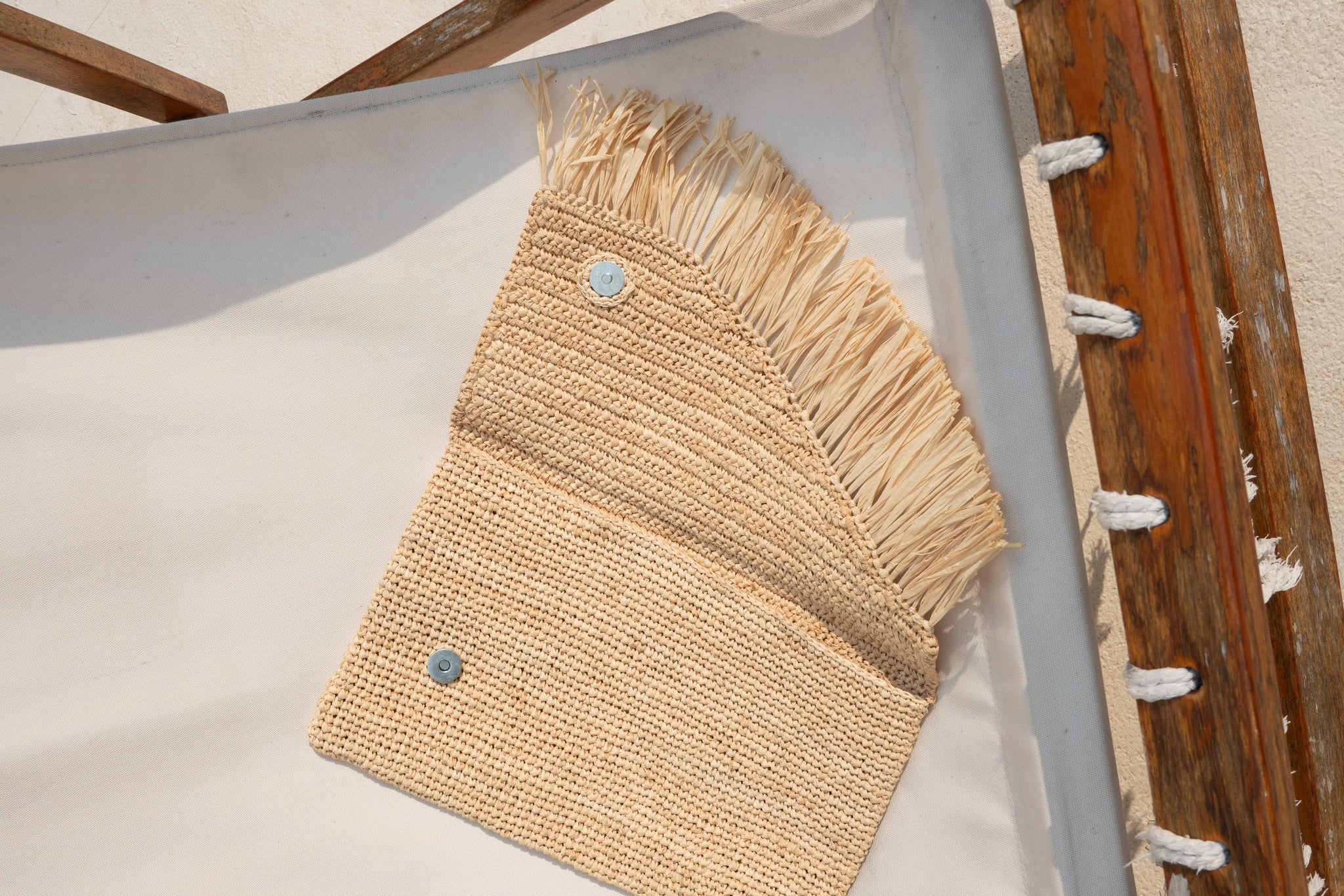 Exquisitely crafted raffia pouch adorned with elegant fringe detailing. Each piece meticulously handwoven by skilled artisans in Madagascar, embodying authentic craftsmanship and sophisticated design.